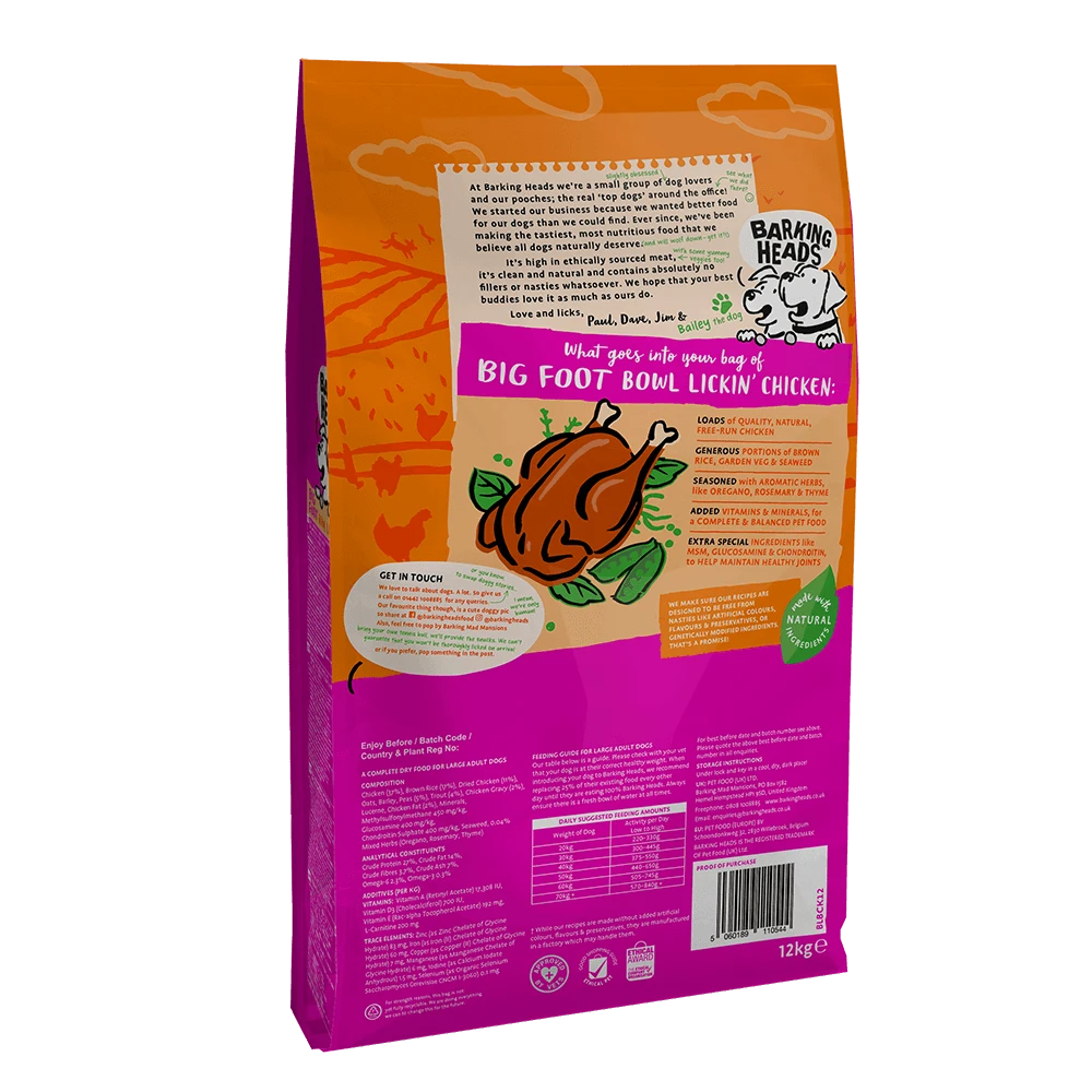 Barking Heads Bowl Lickin’ Chicken dry dog food for Large Breed Dogs is made with 100% natural free-run chicken. This super yummy adult large breed recipe is made using only the best quality, natural ingredients, approved by vets, Bowl Lickin’ Chicken also contains added joint support. Blended with a seriously yummy combination of garden veg and herbs, this chicken dinner isn’t called “Bowl Lickin” for nothing! Plus it’s totally gluten-free!