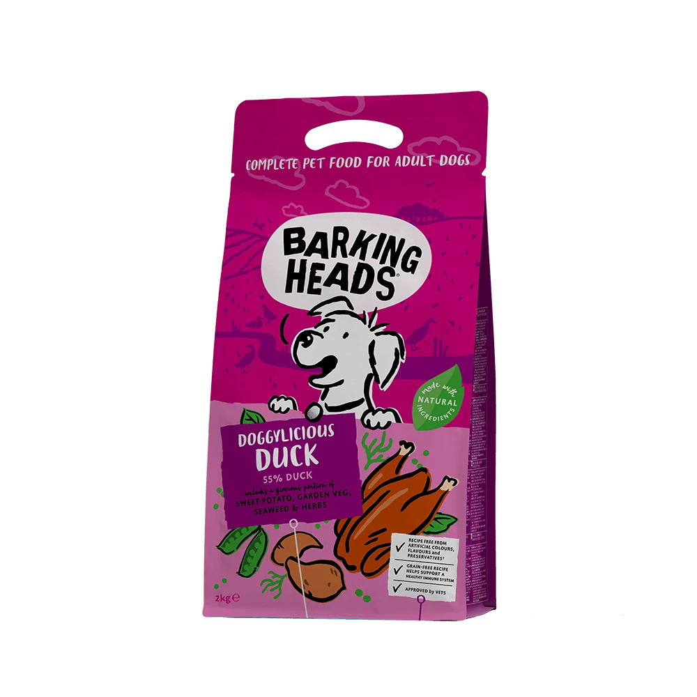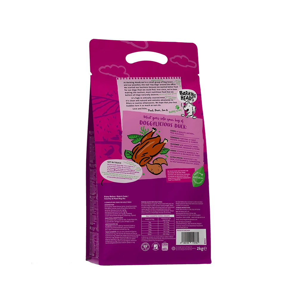 Barking Heads Doggylicious Duck dry dog food is made with 100% natural free-run duck. This super yummy adult dog recipe is made using only the best quality, natural ingredients. Approved by vets, Doggylicious Duck is naturally hypoallergenic, contains added joint support, and is completely grain free. Blended with a seriously yummy combination of sweet potato, peas & herbs, this delicious duck dinner will set tails wagging!