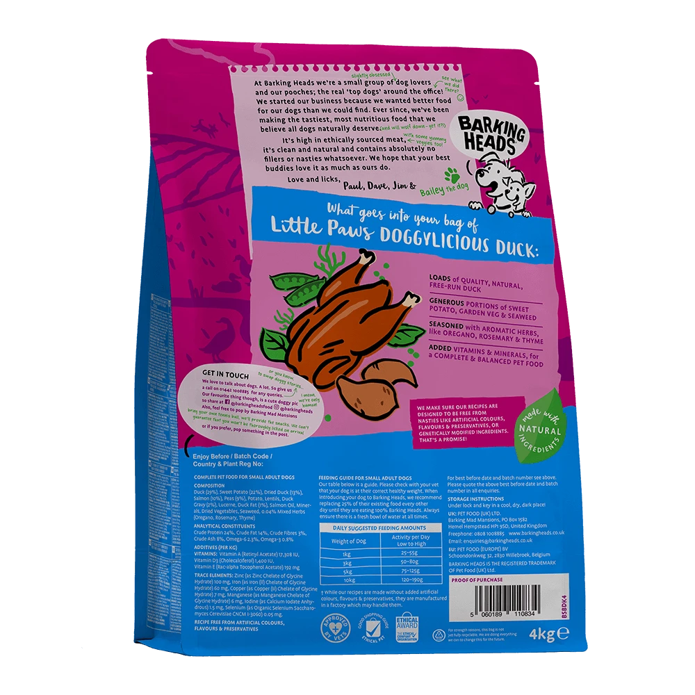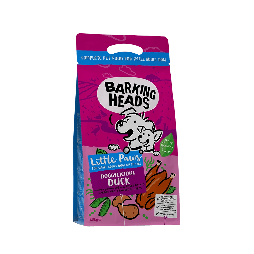 Barking Heads Doggylicious Duck for Small Breed Dogs is made with 100% natural free-run duck. This super yummy adult small breed recipe is made using only the best quality, natural ingredients, approved by vets, Doggylicious Duck is also naturally hypoallergenic. Blended with a seriously yummy combination of sweet potato, peas & herbs, this delicious duck dinner will set tails wagging! Plus itβs totally gluten-free!