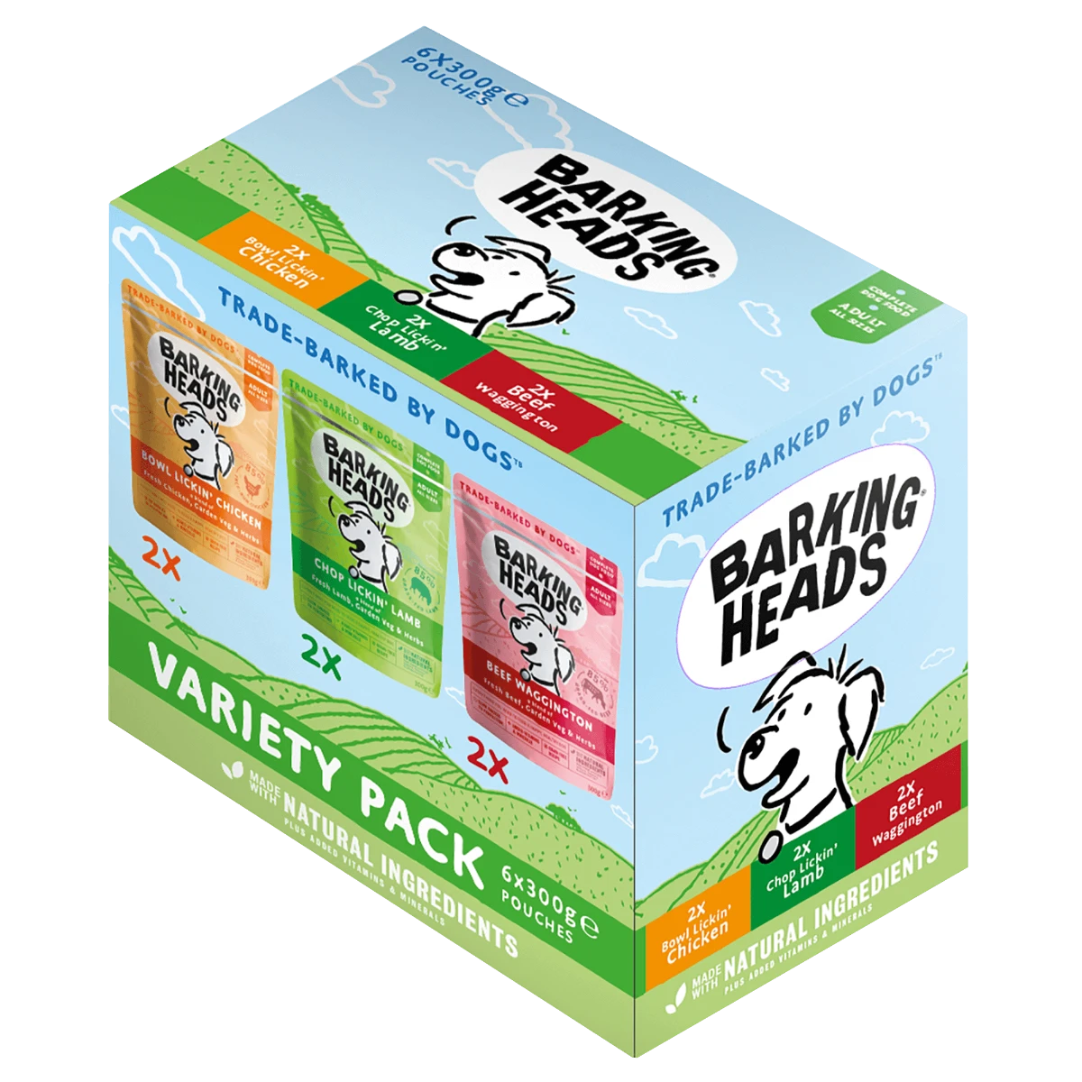 The Barking Heads Wet Dog Food Variety Pack Contains: 2 x Chicken, 2 x Lamb, 2 x Beef 300g wet dog food pouches