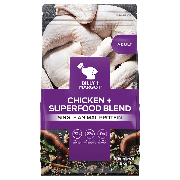 Chicken (72%), Superfood Blend* (Whole Field Peas, Red Lentils, Chick Pea Flour, Pea Protein, Dried Sweet Potato (3%), Coconut Oil, Flaxseed (0.2%), Rosemary Extract, Chicory Root Extract, Manuka Honey, Dehydrated Alfalfa, Brewers Dried Yeast, Yucca Schidigera Extract, Dried Kale, Dried Spinach, Dried Carrot, Pumpkin Power, Dried Blueberry, Dried Cranberry, Chia Seed, Ginger Root, Turmeric), Chicken Oil (2%), Minerals. *Min Superfood Blend 27%