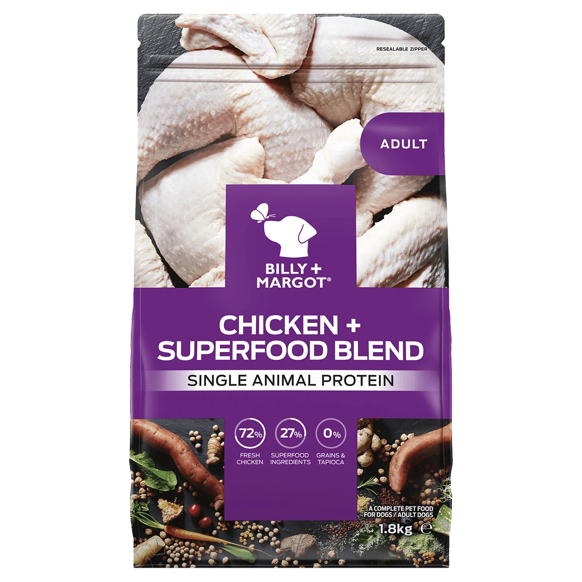 Chicken (72%), Superfood Blend* (Whole Field Peas, Red Lentils, Chick Pea Flour, Pea Protein, Dried Sweet Potato (3%), Coconut Oil, Flaxseed (0.2%), Rosemary Extract, Chicory Root Extract, Manuka Honey, Dehydrated Alfalfa, Brewers Dried Yeast, Yucca Schidigera Extract, Dried Kale, Dried Spinach, Dried Carrot, Pumpkin Power, Dried Blueberry, Dried Cranberry, Chia Seed, Ginger Root, Turmeric), Chicken Oil (2%), Minerals. *Min Superfood Blend 27%