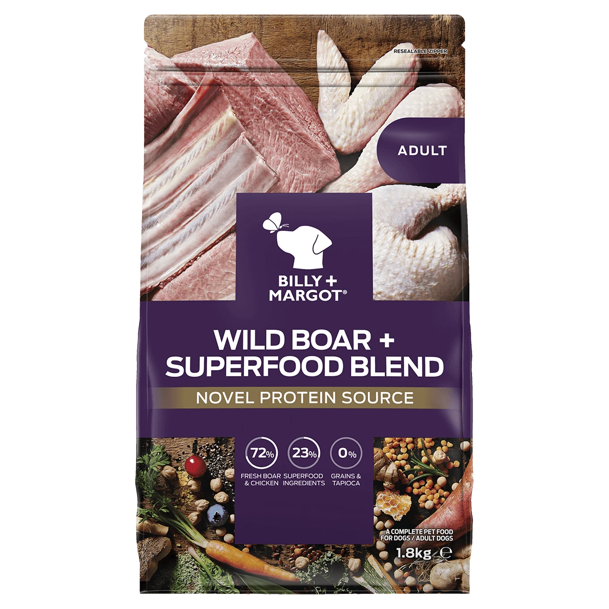 Wild Boar (36%), Chicken (36%), Superfood Blend* (Whole Field Peas, Red Lentils, Dried Sweet Potato (6%), Chick Pea Flour, Pea Protein, Flaxseed (1%), Coconut Oil, Chicory Root Extract, Manuka Honey, Dehydrated Alfalfa, Rosemary Extract, Yucca Schidigera Extract, Brewers Dried Yeast, Dried Kale, Dried Spinach, Dried Carrot, Pumpkin Powder, Dried Blueberry, Dried Cranberry, Chia Seed, Ginger Root, Turmeric) Chicken Oil (3%), Minerals. *Minimum Superfood Blend 23%