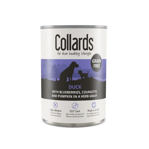 Collards Grain Free Duck in Gravy is a hypoallergenic wet dog food suitable for all dog breeds. This recipe contains essential proteins from quality meats and a combination of vegetables to provide your dog with a nutrient rich diet.