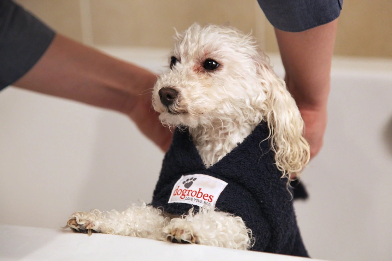 Different dogs will have different drying times but generally leave the Dogrobe on for around 30 minutes and take it off when it’s damp.