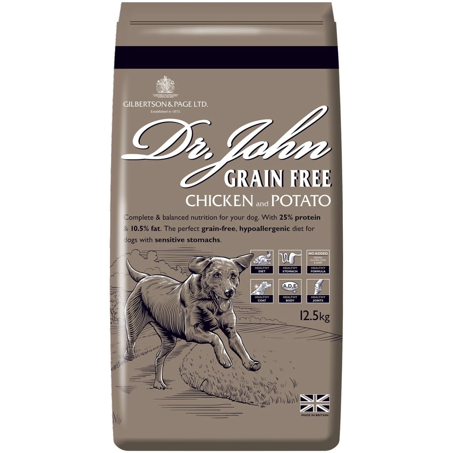 Dr John Grain-Free Dog Food is a completely grain-free food formulated for sporting and working dogs that require a sensitive diet or those dogs that have difficulty in digesting cereals. The formulation is built upon an excellent chicken base of 33%. This contributes to the protein level of 25% and an oils and fats level of 10.5%, making it an ideal feed for working dogs and well-exercised dogs from 8 months upwards. As well as chicken and potato, the recipe contains vegetables and gravy.