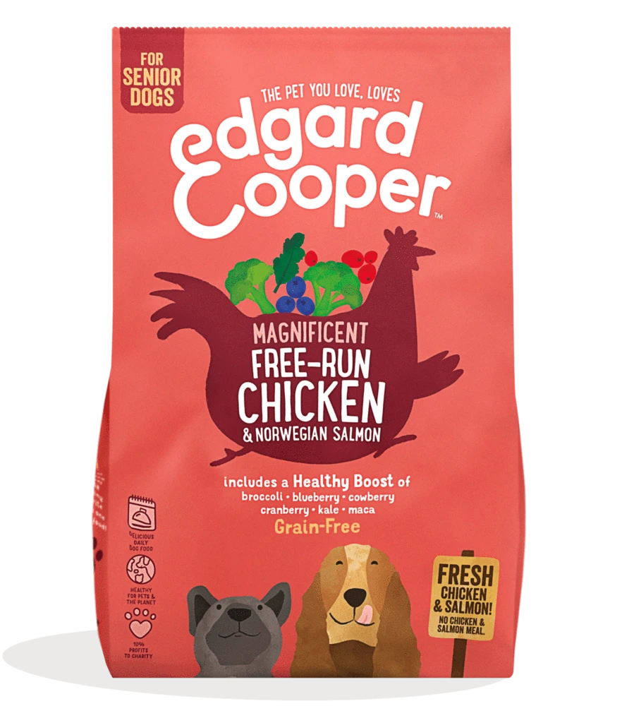 Edgard & Cooper’s Fresh Free-Run Chicken & Norwegian Salmon with broccoli, blueberry, cranberry & cowberry senior dry dog food – yum!