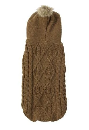 Cable hoody jumper for dogs. Features easy to fit jumper with back leg straps you can choose to use, back neck lead to collar space and fleece lined hood with faux fur pom pom.