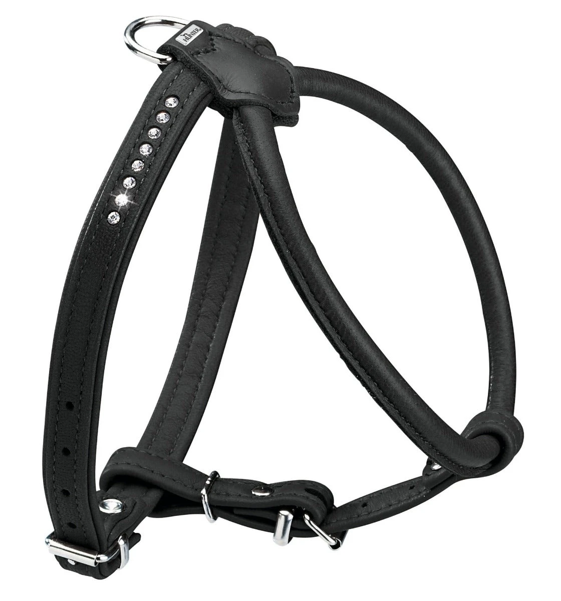 HUNTER has developed the lightweight ROUND & SOFT LUXUS ELK PETIT harness especially for smaller dogs. This lightweight, soft harness with shining stone decorations is a perfect fit for Pugs and French Bulldogs in particular, and for smaller dogs in general too. The lightweight ROUND & SOFT LUXUS ELK PETIT harness has been designed specifically with smaller dogs in mind. Various elements of the harness ensure optimum wearing comfort – the clever fit which is tailored towards smaller physiques, the soft and supple Scandinavian elk leather and the rounded-profile which is particularly comfortable to wear and is very gentle on the fur, even for long-haired dogs. Thanks to a nylon inlay concealed within the rounded elk leather, the ROUND & SOFT LUXUS ELK PETIT harness is very sturdy despite its delicate and lightweight design. The decorative stones embedded in the surface of the harness provide a hint of luxury. Notice: Sometimes the colour may rub off slightly.