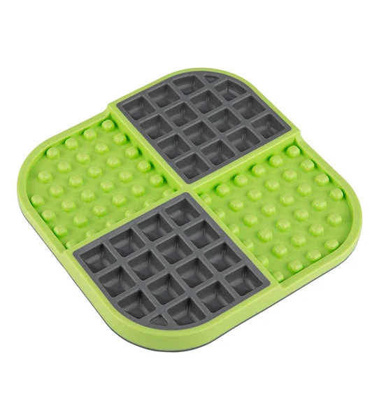 TheĀ LickiMatĀ Slomo Treat MatĀ in green is great to reduce anxiety and defeat boredom. Two different surfaces divided into four sections allows different food to be served at the same time.
