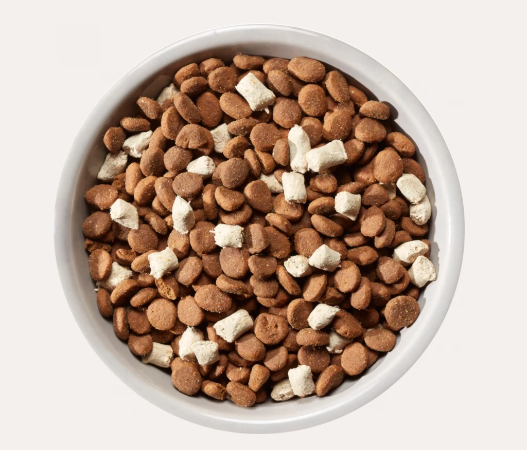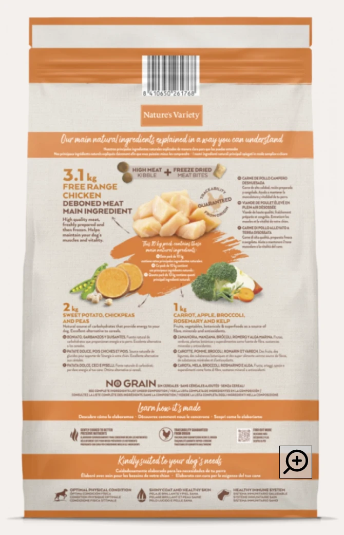 The complete and natural dry dog food with an added boost. Gently freeze-dried, real meat pieces with delicious grain-free kibble made from deboned free range chicken and nutritious superfoods.