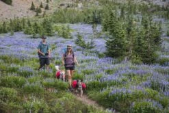 The Palisades Dog Pack enhances multi-day backcountry adventures with features like removable saddlebags, two collapsible hydration bladders, and a cross-load compression system. Four points of attachment securely connect the saddlebags to the modified Web Master Harness frame, ensuring load stability and comfortable weight distribution.