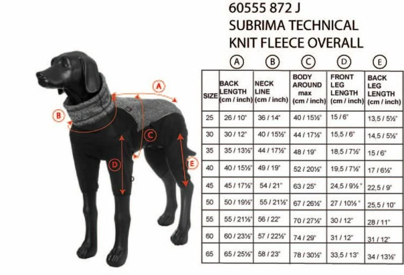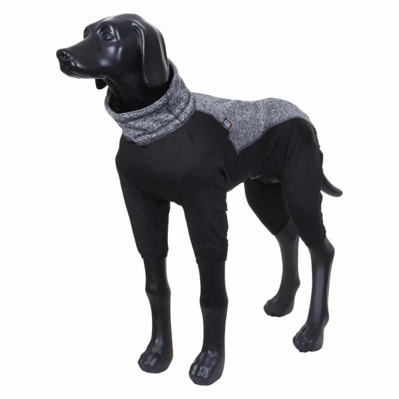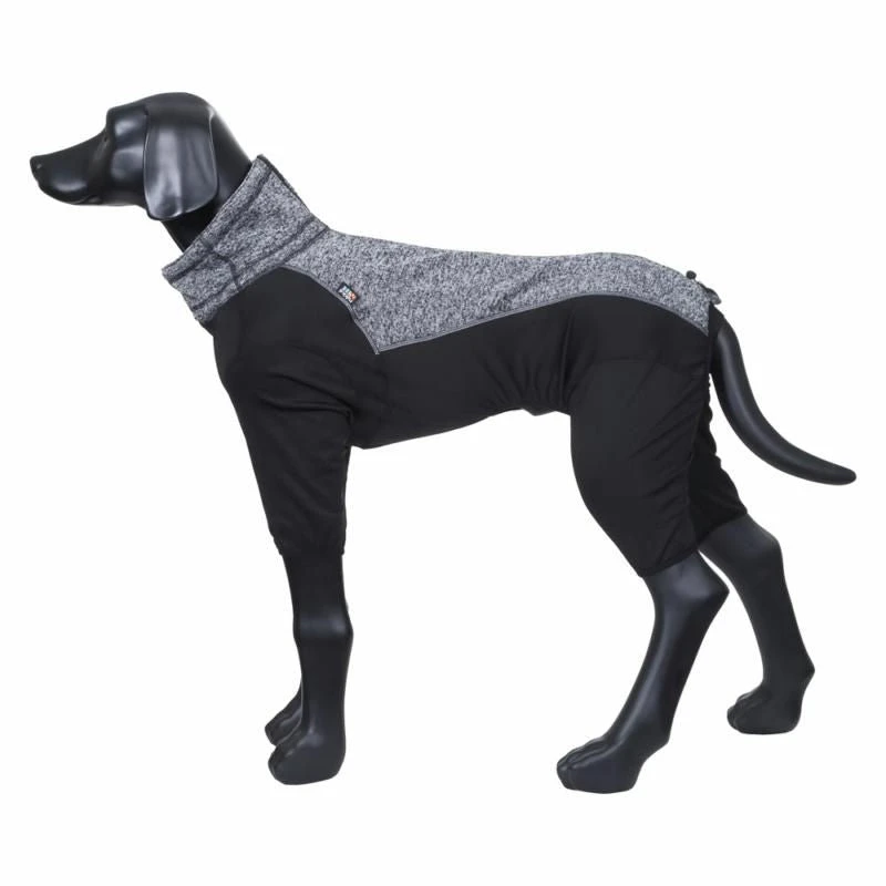 A well-fitting dog fleece overall to keep your dog warm in cool weather conditions. The overall, made of a combination of technical materials, is also lightweight to wear. The back panel of the overall is made of marled knit and the under panel and legs of extremely elastic tricot knit with a smooth surface. Both materials have a soft brushed inner lining. The excellent cut of the overall adapts to your dog’s movements making it almost unnoticeable. Therefore, the garment is perfect for a dog that is not used to wearing clothes. The material of the under panel is practical: splashes are easy to wipe off and it dries fast. Thanks to the zip closure on the back, the overall is quick and easy to put on. An adjustable neckline and collar add the final touch for the perfect fit and protection. The garment has a reflective trim stitched on top of the important seams.