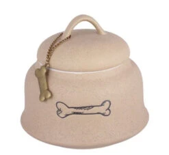 This sandstone effect dog treat jar features a charming polished bone and fish charm and is the perfect treat jar to store your dog’s or cat’s treats keeping them fresh and delicious!