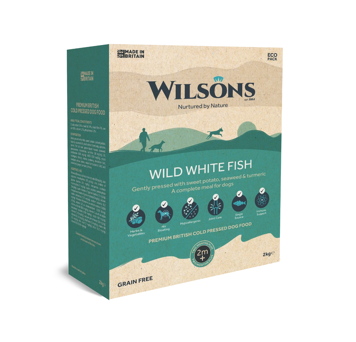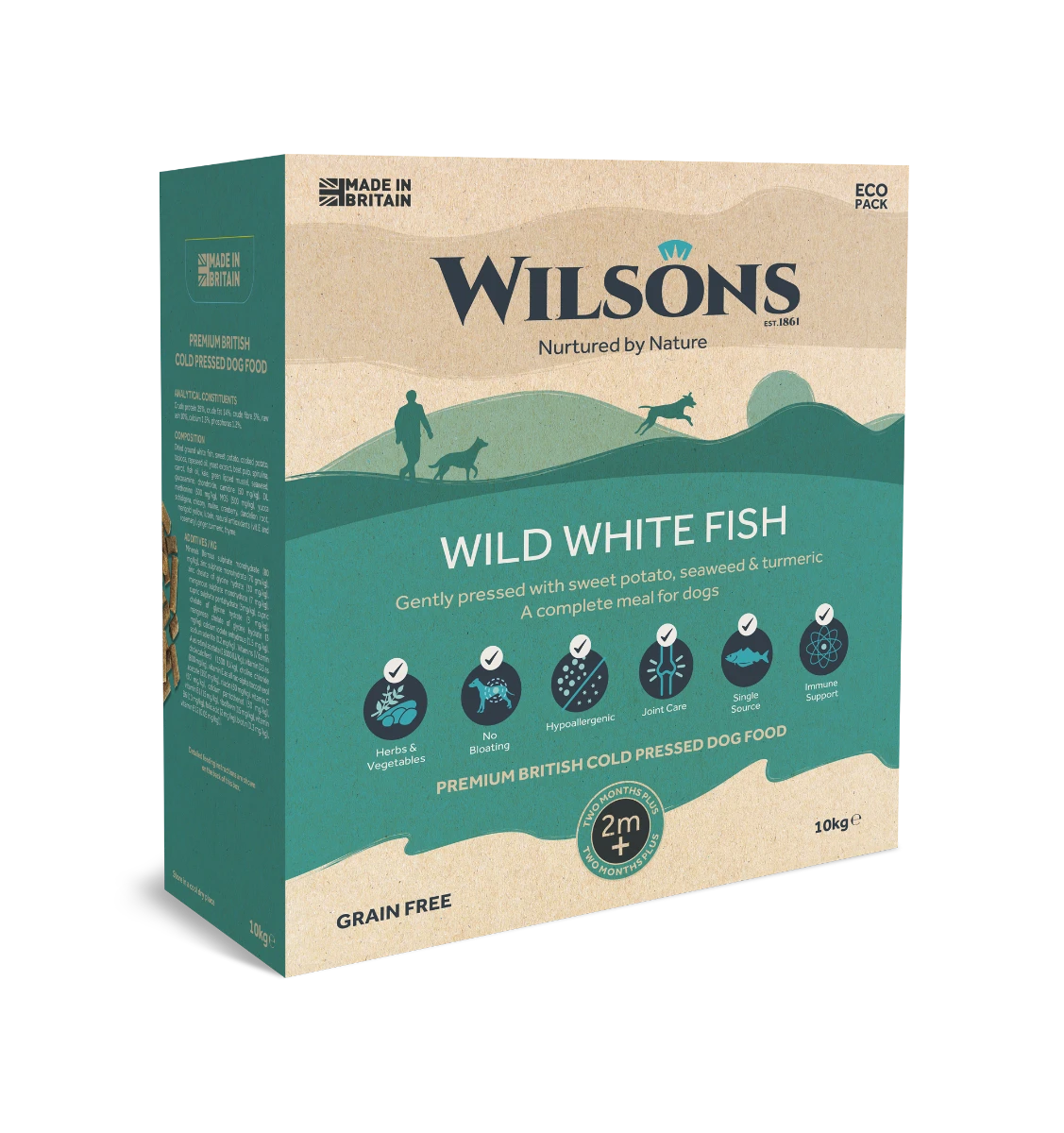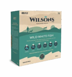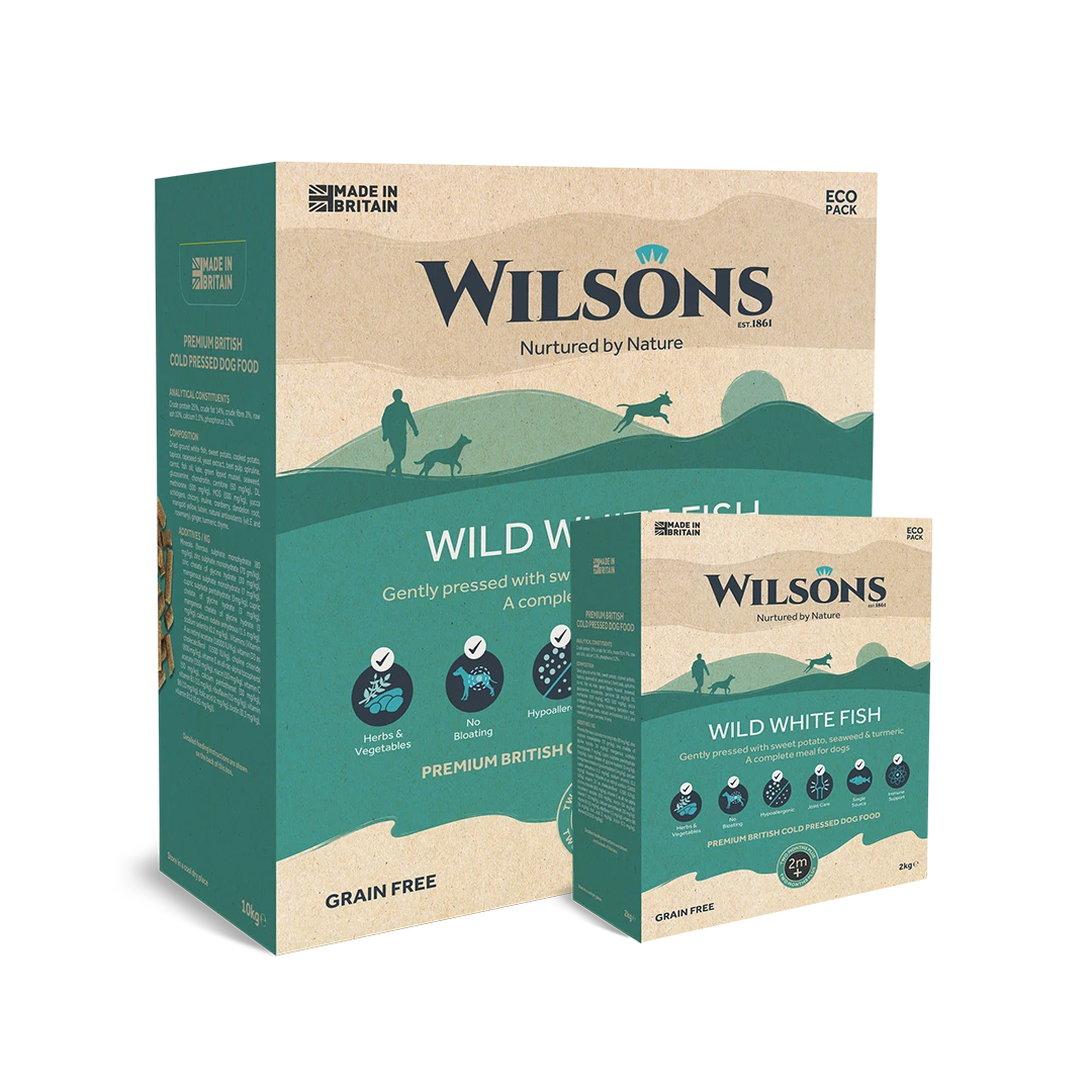Available in 2kg or 10kg eco packs, Wilsons’ Wild White Fish is a complete grain-free premium British dry dog food and is gently pressed withsweet potato, seaweed and turmeric in their Scottish factories.